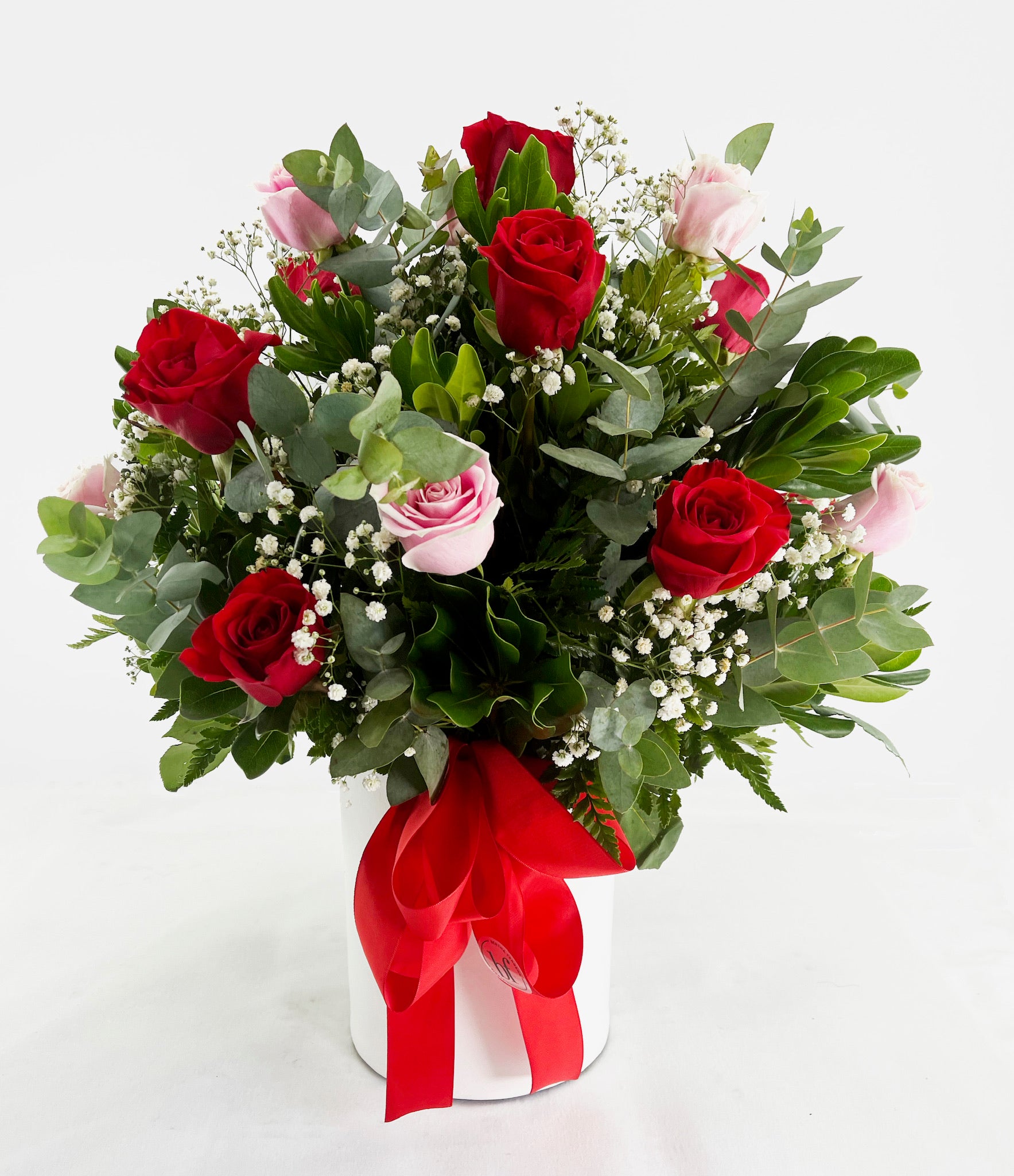 1 docena y media de rosas en base de ceramica alta blanca.