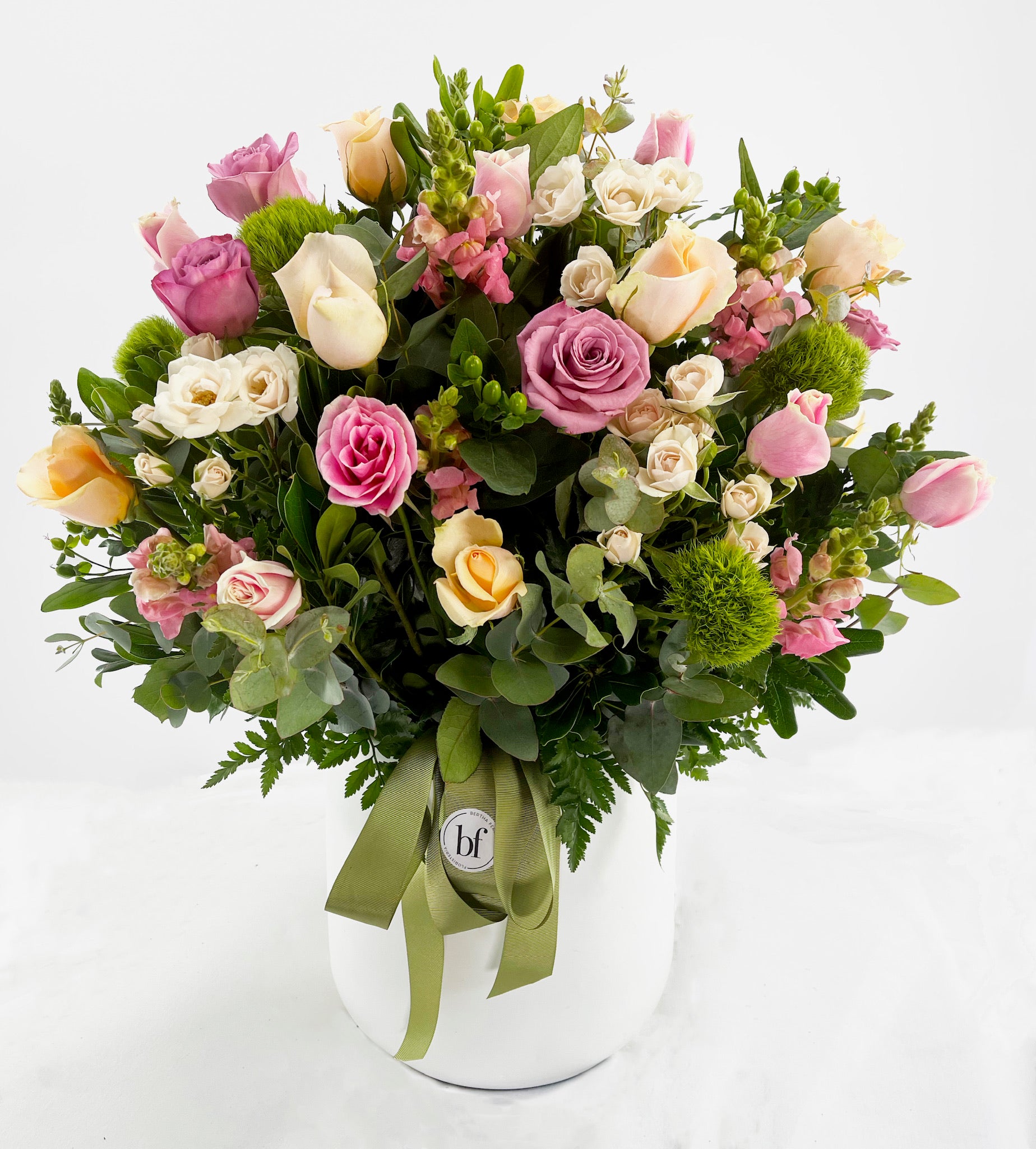 3 docenas de flores primaverales en base de ceramica alta.