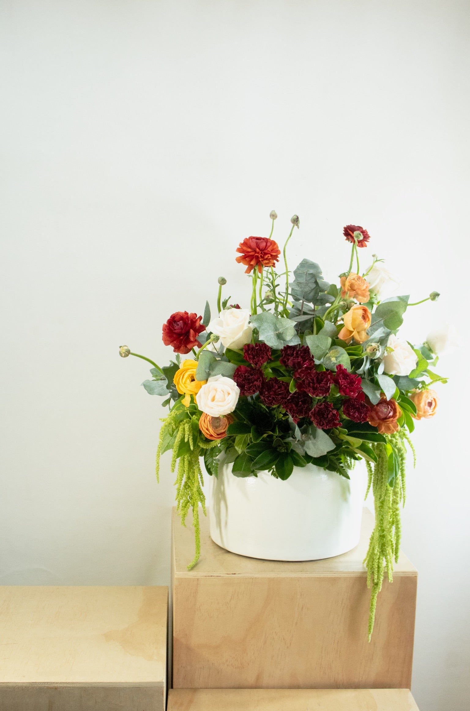 4 docenas de flores en tonos naranja base de cerámica grande.