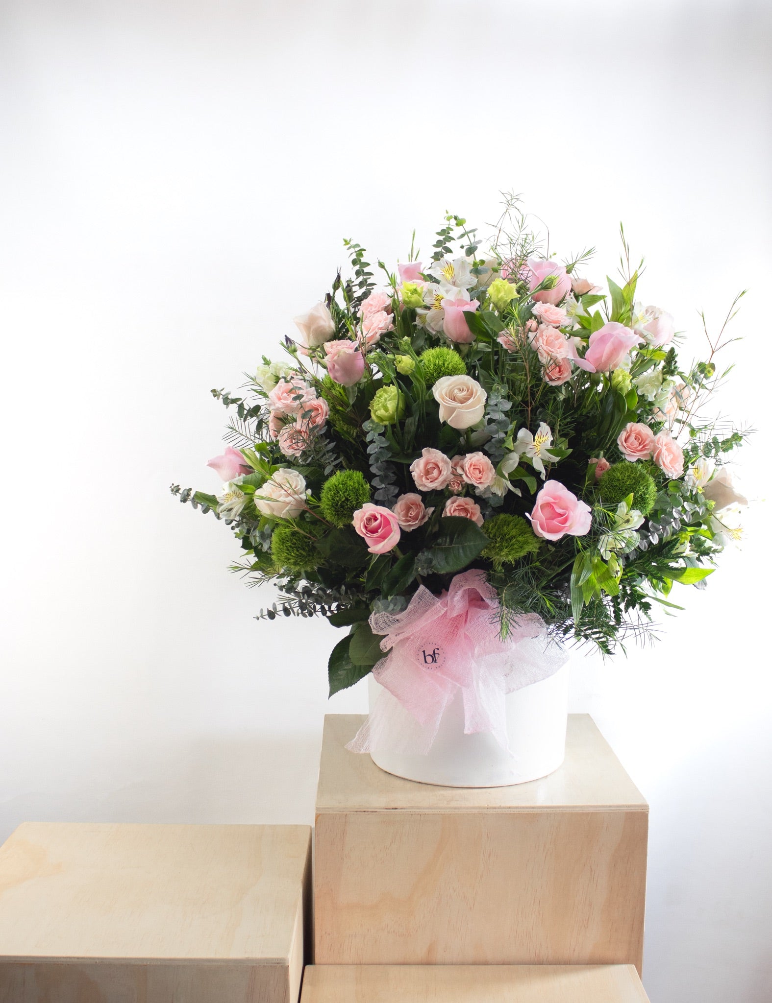 4 docenas de flores primaverales en tonalidades rosadas, en base de ceramica.