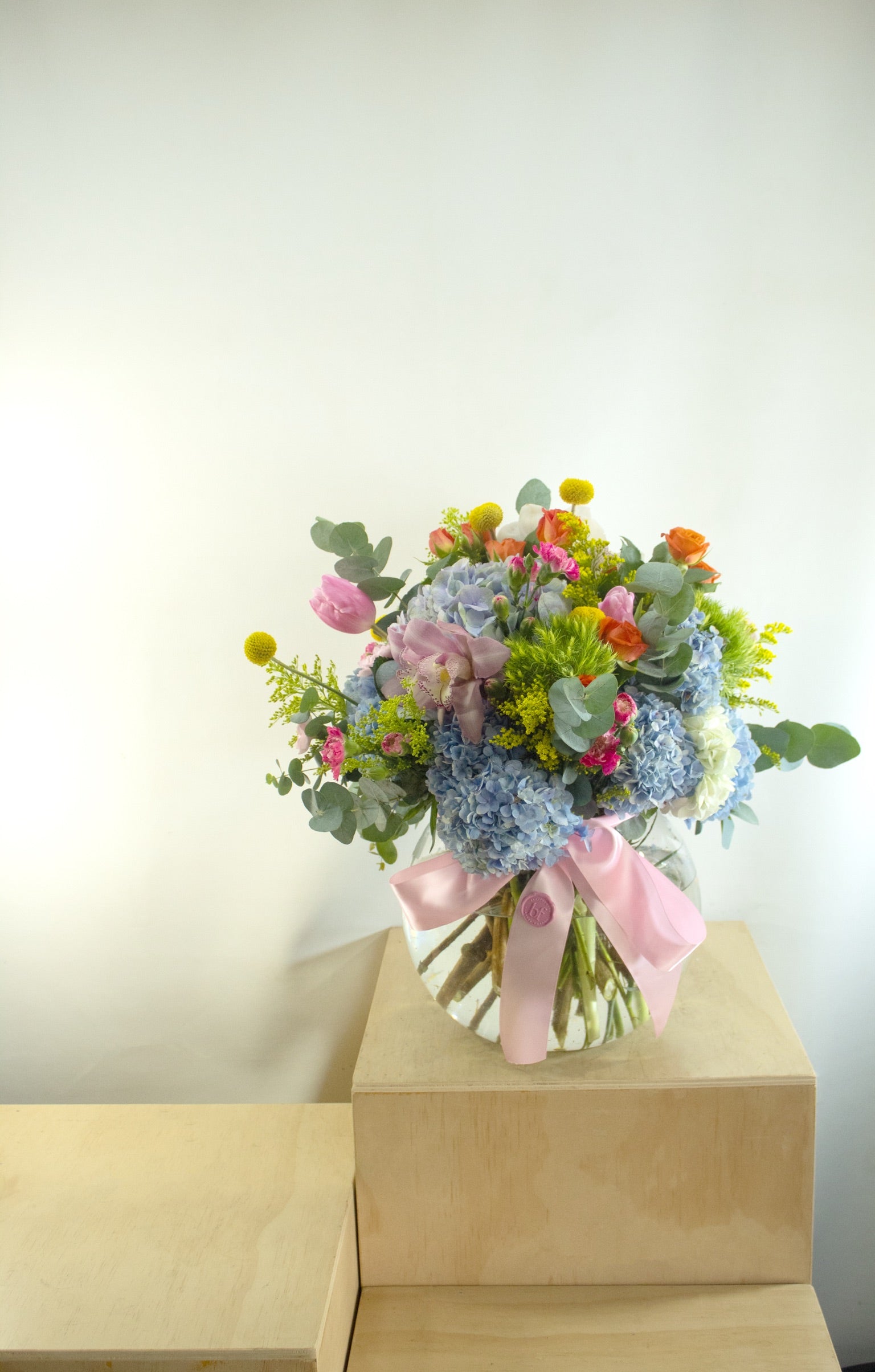 3 docenas de flores primaverales tonos de verano en base de vidrio