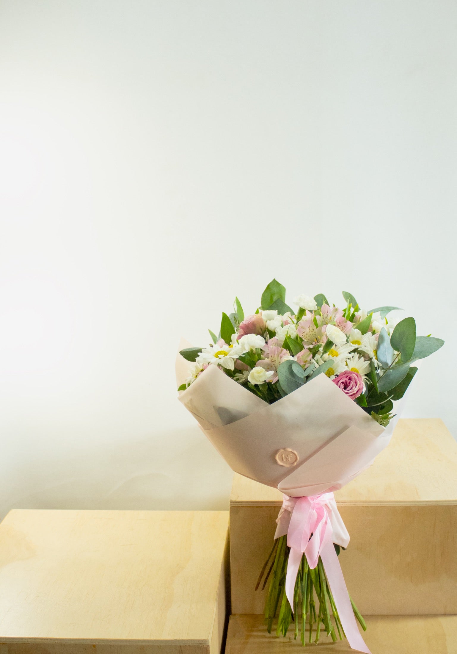 Ramo de 1 docena y media de flores en papel rosado suave.